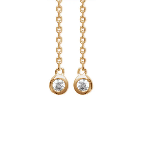 À propos : craquez pour la délicatesse des Célestes. Elles se composent d'une petite chaîne dorée avec à l'une de ses extrémités un petit zirconium et à l'autre une fine pointe rigide. Cette paire de boucles d'oreille chaine en plaqué or 18 carats résiste à l'eau et ne ternit pas.