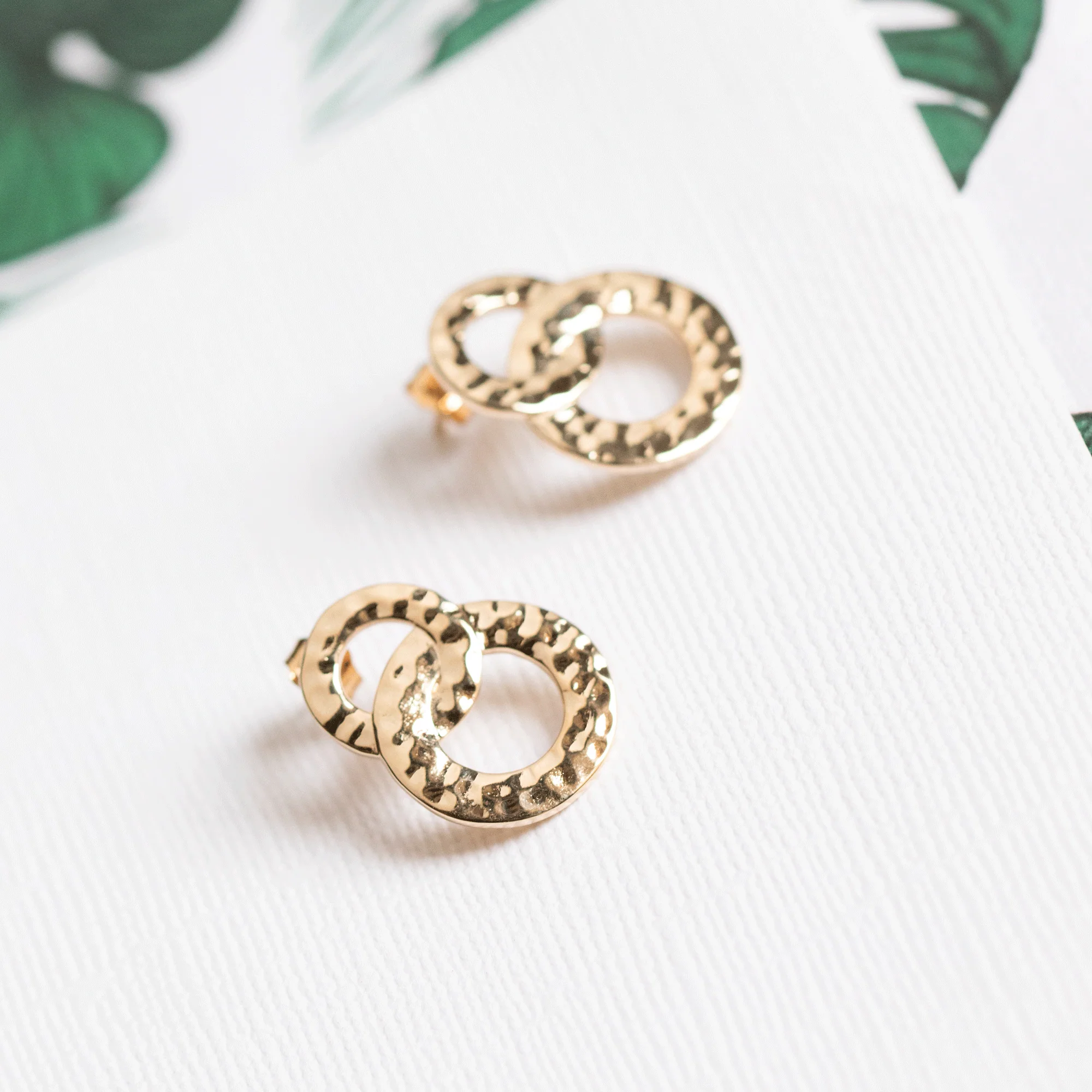 À propos : composée de deux anneaux plats délicatement martelés et entrelacés, cette petite paire de boucles d'oreilles donnera le ton à votre tenue ! En plaqué or 18 carats, elles résistent à l'eau et ne ternissent pas.