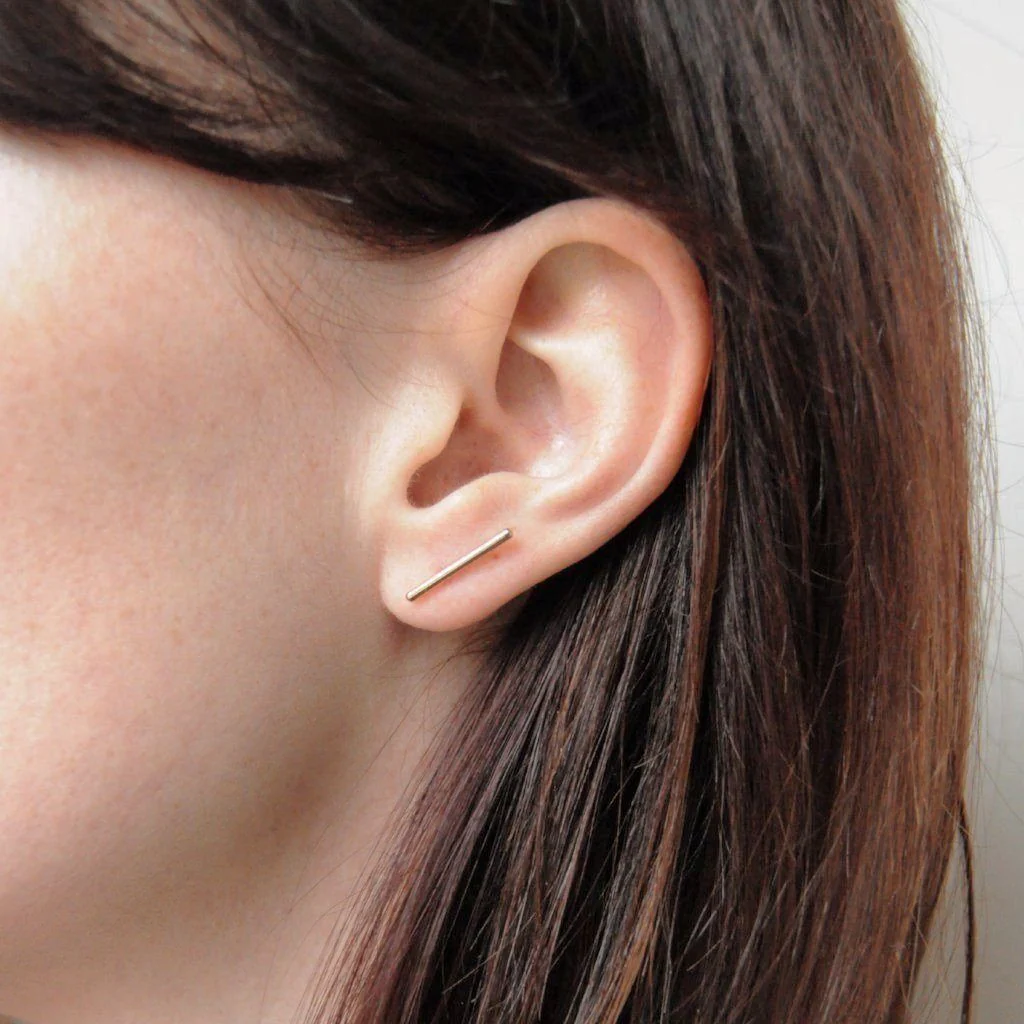 À propos : ces petites puces d'oreilles au style minimaliste se composent tout simplement d'une fine ligne droite polie. En plaqué or 18 carats, ces boucles d'oreilles ligne résistent à l'eau et ne ternissent pas.